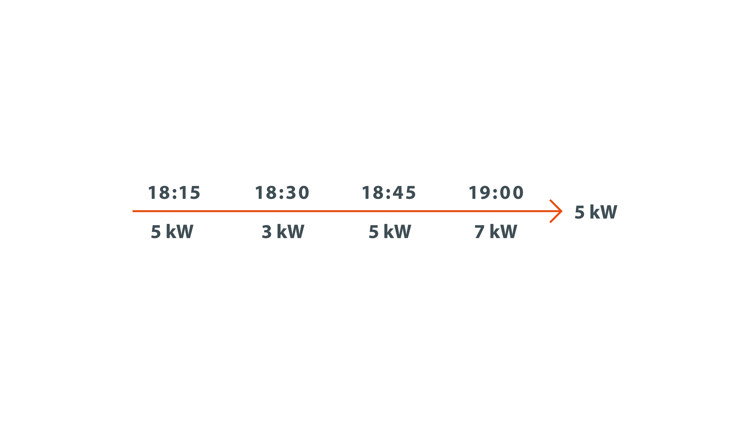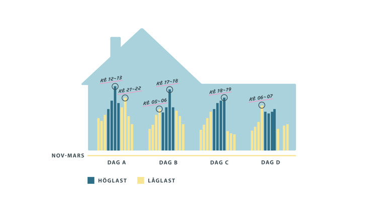 - Från november till mars (perioden med höglasttider) använder vi två medelvärden varje månad för att räkna ut din effektavgift: ett för höglasttid och ett för låglasttid. Det innebär att vi räknar på ett genomsnitt av de tre högsta timvärdena/effekttopparna vardagar kl. 07–19 (höglasttid), och ett medelvärde av dina tre högsta timvärden/effekttoppar alla övrig tid (låglasttid). Se exempel i bild nedan.