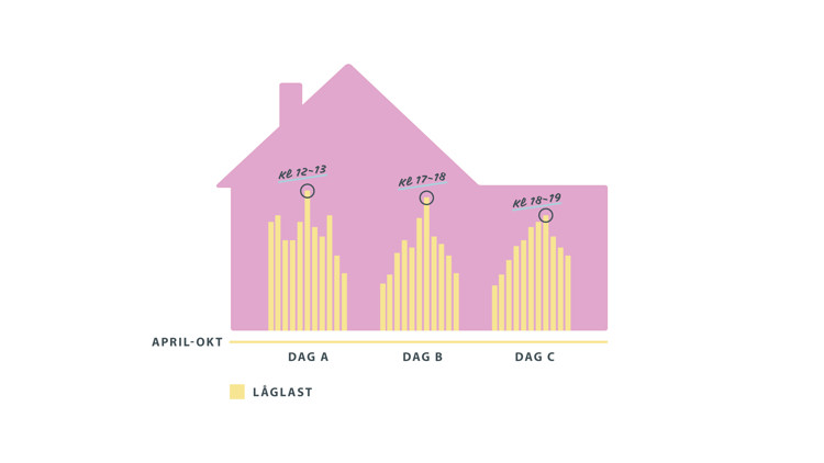 - Från april till oktober har vi bara låglasttid. Då räknas alla timvärden lika och vi använder endast ett genomsnitt av de tre högsta timvärdena/effekttopparna per månad. Se exempel i bild nedan.