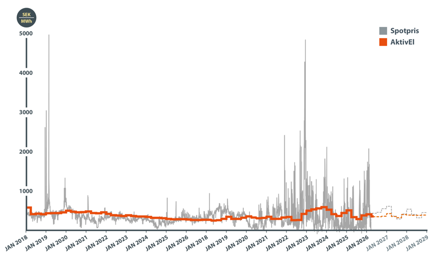 Inköp av el sker löpande under avtalstiden. Genom att vi prissäkra inköpen framåt i tiden kan AktivEl ge ett mer stabilt och förutsägbart elpris än marknaden. Genom att köpa el vid strategiska tidpunkter sprids risken över tid, samtidigt som regelbundna elinköp gör att elpriserna jämnas ut. På så sätt slipper ni stora svängningar, och får ett så lågt och stabilt elpris som möjligt över tid.
