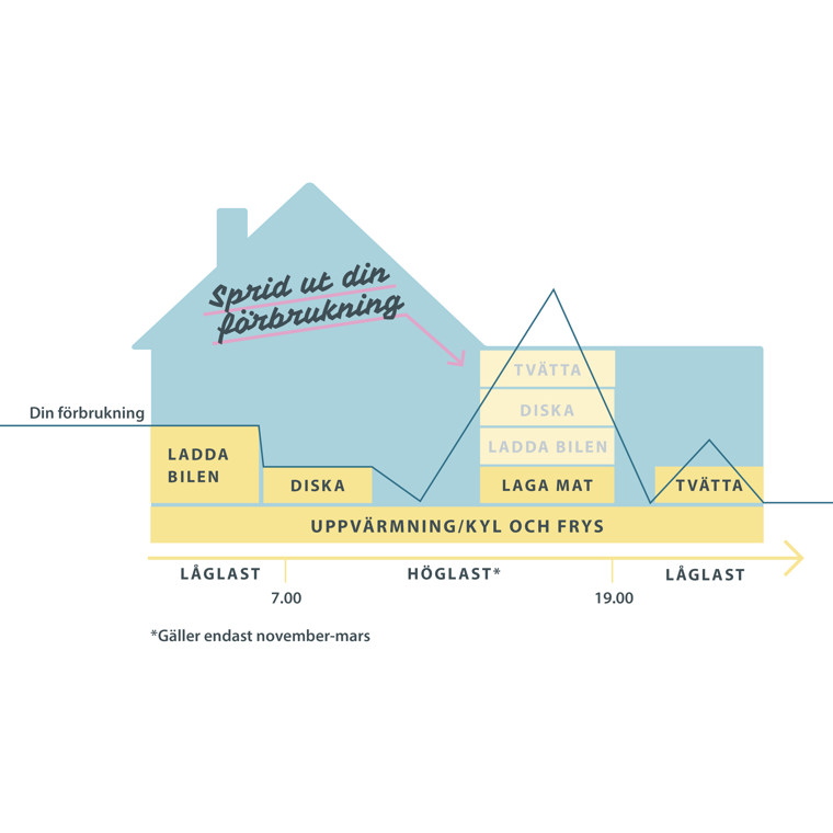 • Försök i stället sprida ut din elanvändning över dygnet. Då sänker du ditt effektuttag och kapar dina effekttoppar, vilket bidrar till att sänka dina elnätskostnader och minska trängseln på elnätet.